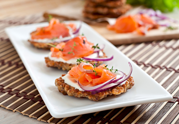 Лосось нарізаємо на невеликі шматочки, а головку червоної цибулі на кільця. Оладки змащуємо сметаною. Зверху викладаємо шматочок лосося та кільце червоної цибулі.