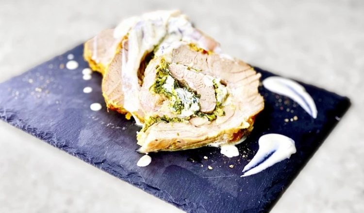 Спочатку приготуємо начинку зі шпинату. Дрібно його нарізаємо та додаємо трішки вершків. Солимо, перчимо та перемішуємо. Готову начинку викладаємо на м’ясо. Зверху посипаємо натертим сиром й загортаємо в рулет.