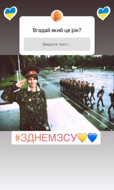 Перед камерою Ірина Білик постала у військовій формі та кашкеті на фоні солдатів.Також в молодості у знаменитості був темний колір волосся. На світлині Ірина Білик зібрала його у хвіст й продемонструвала милу усмішку.
