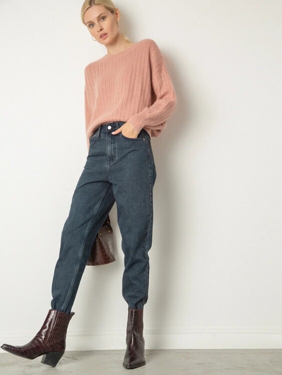 - Пилючно-рожевий джемпер буде гарно виглядати в дуеті з деніму темних кольорів. Благородне поєднання кольору, яке підійде для незапланованих походів по магазинах або для звичайної прогулянки.