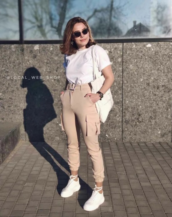 Доповнювати карго можна однотонними футболками або топами. Із взуття краще всього підійдуть кросівки. У прохолодну вітряну погоду поверх футболки можна накинути бомбер.
