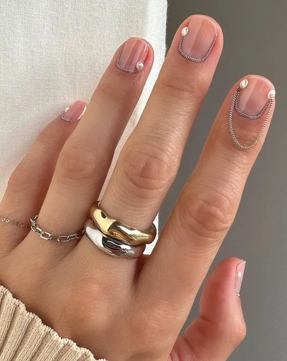 На нейтральному відтінку лаку можна зробити орнамент за допомогою намистин. Радимо вам вибирати декор середнього розміру, тому що саме він виглядає дуже стильно.