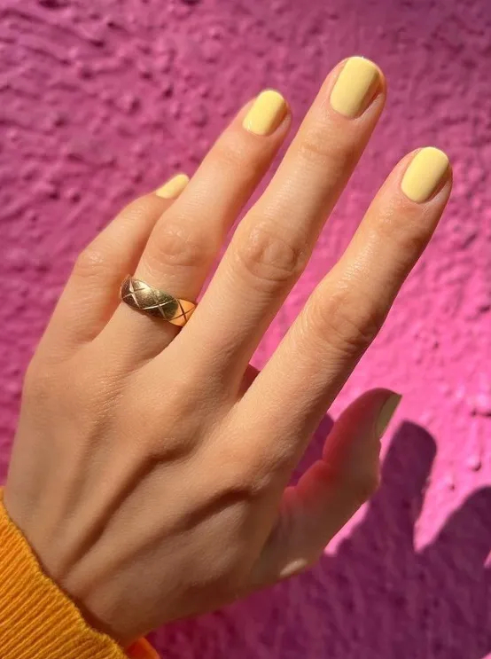 Якщо ви хочете, щоб нігті не виблискували, спробуйте нанести матовий топ на гель-лак. Щодо кольору, то краще вибирати яскраві відтінки: жовтий, рожевий, блакитний.