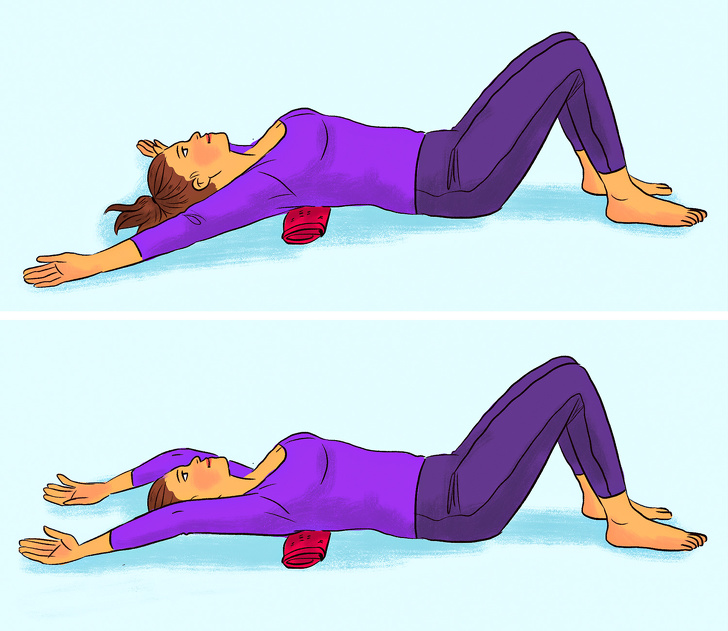 Згорніть рушник (або навіть два) таким чином, щоб у вас вийшов валик. Краї по обидва боки можна скріпити скотчем. Тепер ляжте на підлогу так , щоб рушник був у вас під лопатками. Ноги зігніть в колінах, прямі руки розведіть в сторони, покладіть на підлогу долонями вгору. Головне, щоб вам було зручно. А тепер розслабтеся. Дихайте глибоко, в цьому положенні потрібно провести не менше 1,5-2 хвилин.