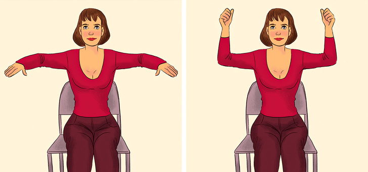 Все так само рівно сидячи на стільці, випряміть руки перед собою. Тепер розведіть їх в сторони, одночасно згинаючи в ліктях під прямим кутом. Ненадовго затримайтеся в цьому положенні. Обов’язково стежте за тим, щоб весь час утримувати руки паралельно до підлоги. Тепер підійміть великі пальці вгору і постарайтеся, повільно піднімаючи руки, вказати назад. Затримайтеся в цьому положенні ненадовго.