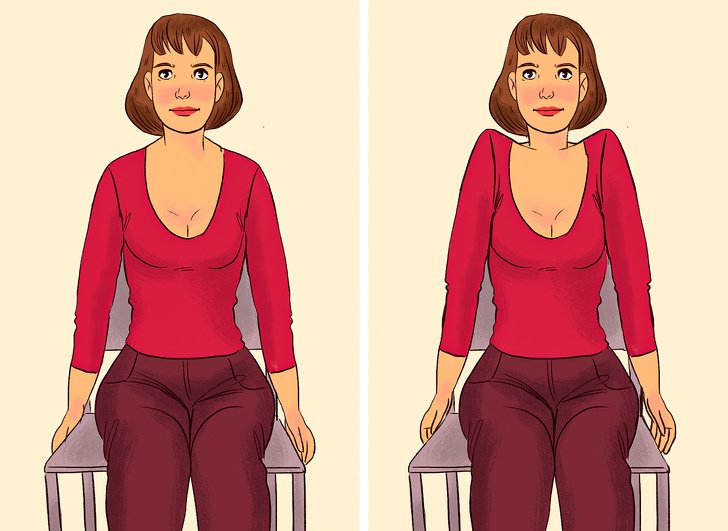 Сядьте на стілець. Тримайте спину прямо і дивіться перед собою. Тепер дуже повільно і акуратно підніміть плечі і на кілька секунд затримайтеся в цьому положенні. Потім так само повільно поверніться до вихідної позиції. Зробіть 5-10 повторів, а при бажанні виконайте ще й модифіковану версію цієї вправи – піднімайте і опускайте плечі по черзі.