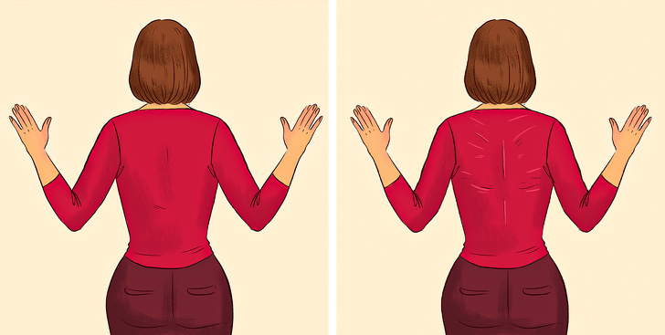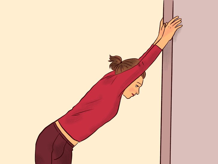 Встаньте лицем до стіни і зіпріться на неї руками. Нахиліться вперед і затримайтеся в цьому положенні на 15-20 секунд. Важливо, щоб ваша спина весь час залишалася прямою, а голова знаходилася з нею на одній лінії. Після цього постарайтеся прогнути спину. Так потрібно простояти ще 15-20 секунд.
