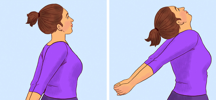 З’єднайте витягнуті руки за спиною і закиньте голову назад. Тепер зведіть лопатки і відведіть руки так далеко, як тільки зможете. Зробіть вдих, а коли будете повертатися у вихідне положення – видих.