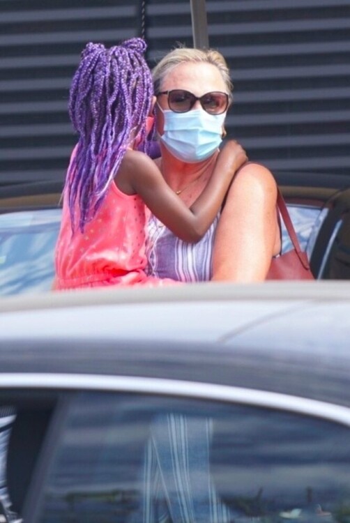Августу несла на руках її бабуся Герда, поки Терон разом з нянею метушилася біля машини. Дівчинка ласкаво обняла бабусю за шию. Рожевий костюмчик дитини ідеально гармоніював з її маскою. Шарліз ж вибрала комбінезон в стилі тай-дай і Біркеншток. Образ завершив крислатий капелюх.