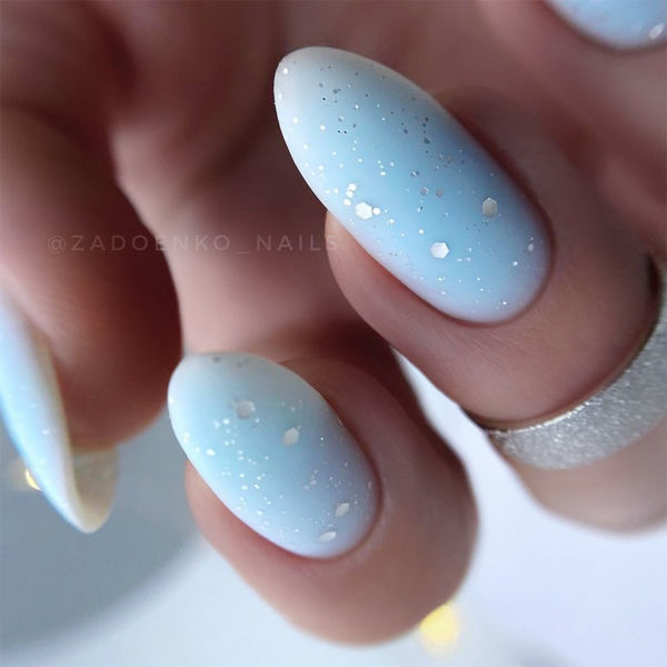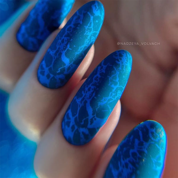 В основу такого манікюру можна покласти будь-який відтінок синього. Блакитний емалевий тон чи синювата напівпрозора база? Чудово. Темно-синій колір, що заворожує своєю глибиною? Теж круто. Вся фішка тут у матовому топі з металізованими шестигранниками (лайфхак: якщо в запасах є відповідні сухі блискітки, можна викласти їх на липкий шар кольору, перекрити базою і потім матовим топом) — ця іграшка повернулася в тренди і завоювала серця всіх «сорок».