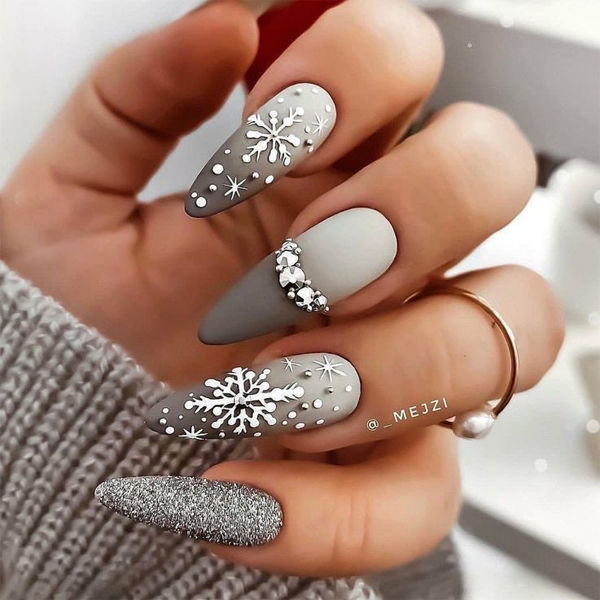 Відтінки сірого у градієнті зі щільним білим – це хіт сезону. Виглядає дуже контрастно та ефектно. Такий градієнт добре виглядає і сам по собі, і в обрамленні страз і блискіток. Якщо вже дуже хочеться новорічного колориту, додайте сніжинок – не помилитеся!