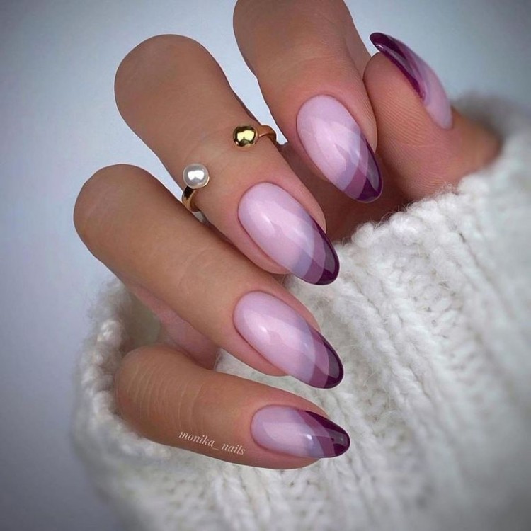 Ще одна цікава форма усмішки активно з’являється на руках модниць і в стрічці Інстаграм – дуга, скошена на один бік. Виглядає найкраще на мигдалеподібній або овальній формі нігтів середньої довжини. Цей варіант виконання актуальної усмішки багатьом сподобається своїм колірним рішенням: кілька послідовно нанесених ліній, що відрізняються на пару тонів але без розмиття — «ніби градієнт» привертає увагу і змушує розглядати такі нігті. Робити цей дизайн досить довго (якщо сподобається, попередьте майстра, щоб заклав хоча б хвилин 40), але ефект однозначно того вартий!