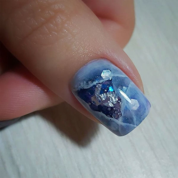 Здається, багатьом жінкам ще довго не набридне захоплюватися цією технікою. Нігті виходять дуже витончені але з такою візуальною глибиною… У синьому кольорі зі сріблястим оздобленням кришталеве каміння — чудовий вибір для новорічного манікюру. Синій Водяний Тигр схвально намуркоче на його володарку і обов’язково відсипле удачі та захисту.
