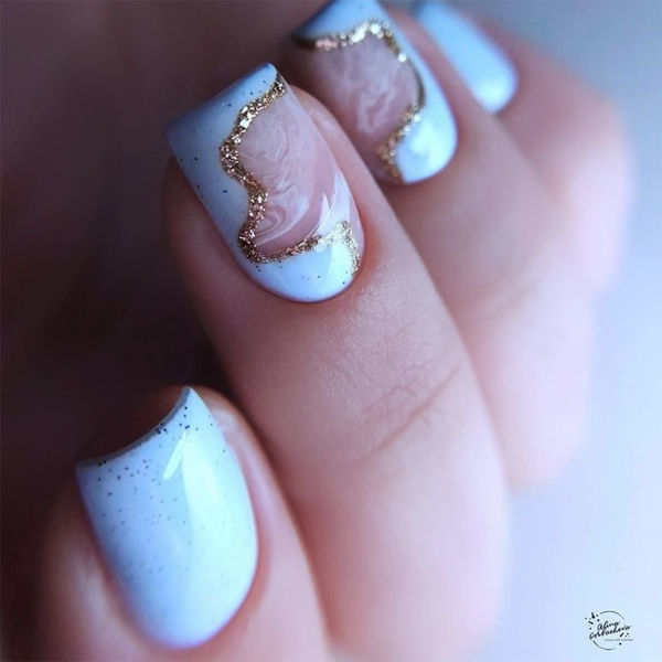 Прості розводи за мотивами мармуру цього сезону вже не такі актуальні. Але, якщо ви їх дуже любите, саме час спробувати все ускладнити. Мармур на прозорій базі або камуфляжі чудово виглядає на ділянці неправильної форми,іншу ж частину нігтя варто покрити щільним білим лаком. Щоб красиво відокремити його від основного кольору, стик можна пофарбувати блискітками або викласти гнучкою металізованою стрічкою (якщо з формою сильно не намудрили , звичайно). Такий манікюр у білих тонах чудово доповнить образ зимової нареченої – рекомендуємо зберегти, якщо вам це актуально!