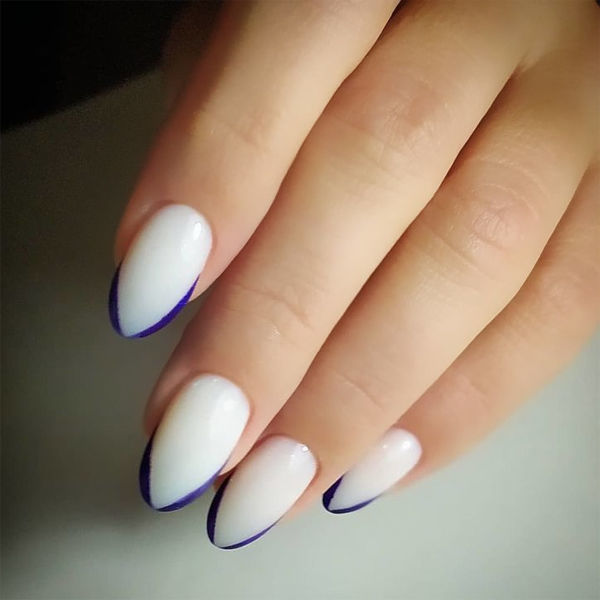 Яка наймодніша варіація френчу цієї зими? Записуйте рецепт: щільний молочний камуфляж, максимально тонка посмішка насиченого кольору, ідеальна форма – з чітко промальованим центральним кутом замість вигину. Якщо ви оберете для усмішки синій відтінок (або ще краще – сині блискітки), він ідеально впишеться у колірну гаму Нового року.