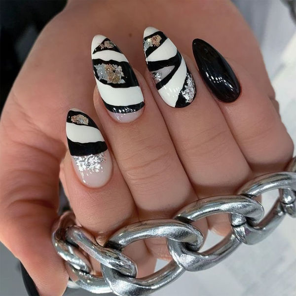 Безпрограшне поєднання на всі часи – білий, чорний та метал. Трендовий варіант такого чорно-білого міксу нагадує шкірку зебри або тигра, а блиск абстрактними фрагментами вписується до меж чорних деталей. Можна надрукувати на них фольгу або акуратно прицільно нанести втирання – виглядатиме по-різному але все одно актуально.