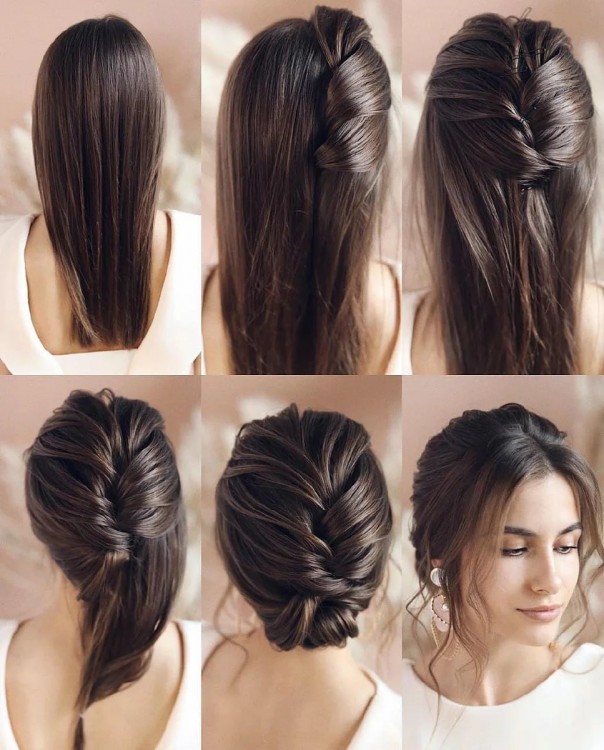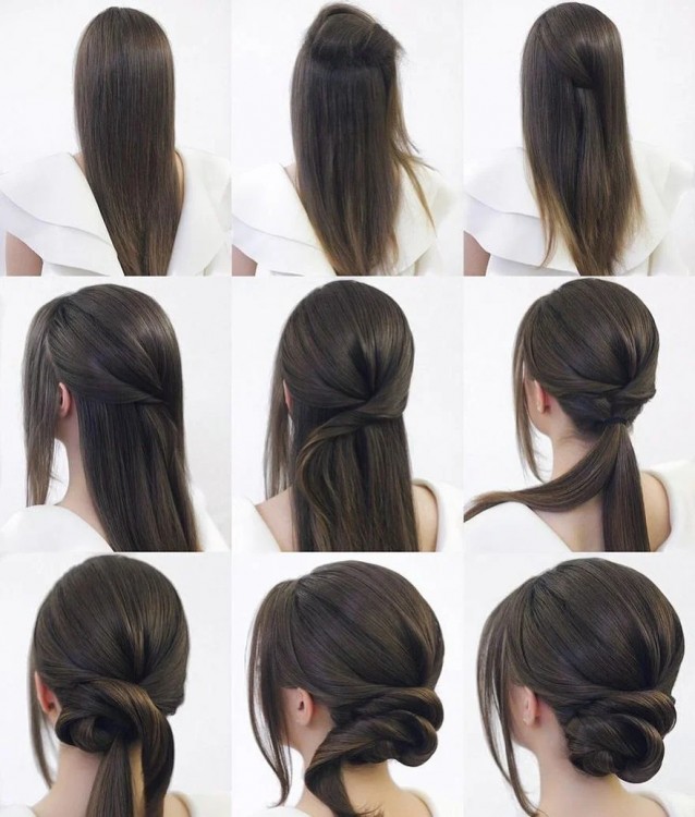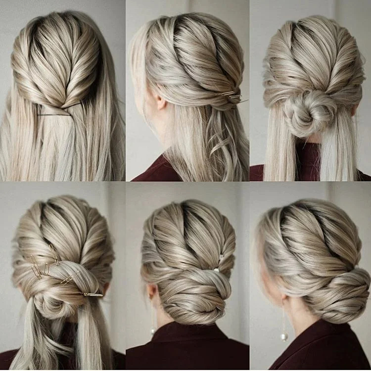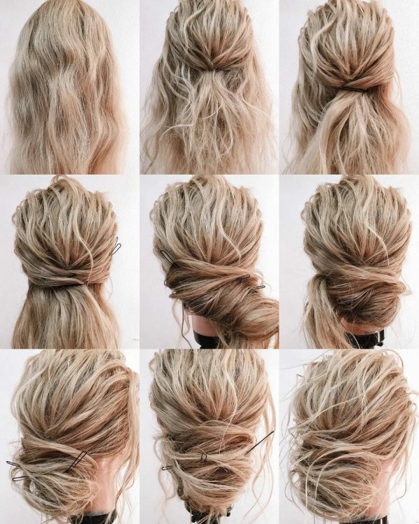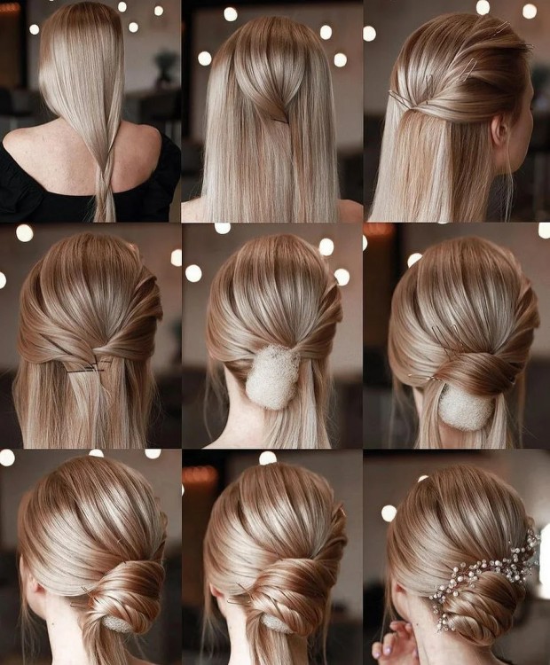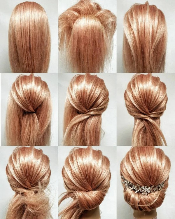 Для створення цієї зачіски не потрібно заплітати волосся. По суті, цей вид пучка має на увазі пасма заправлені всередину і зафіксовані шпилькою. Проста зачіска підійде навіть для урочистого образу жінки.