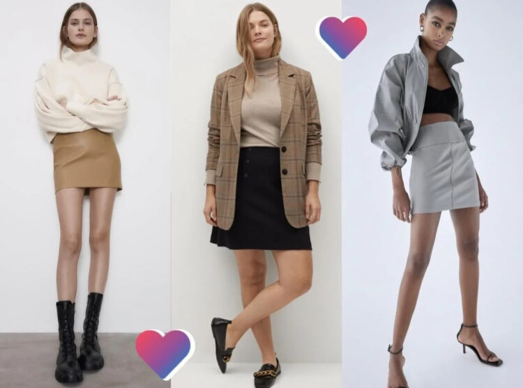 Найактуальніша форма міні-спідниць – це трапеція, або А-силует. Таку спідницю найкраще поєднувати з закритим верхом, а от взуття може бути будь-яке – хоч чоботи, хоч кросівки, хоч мінімалістичні босоніжки. Поки на вулиці не потепліло, носіть міні-спідниці тільки зі щільними колготками.