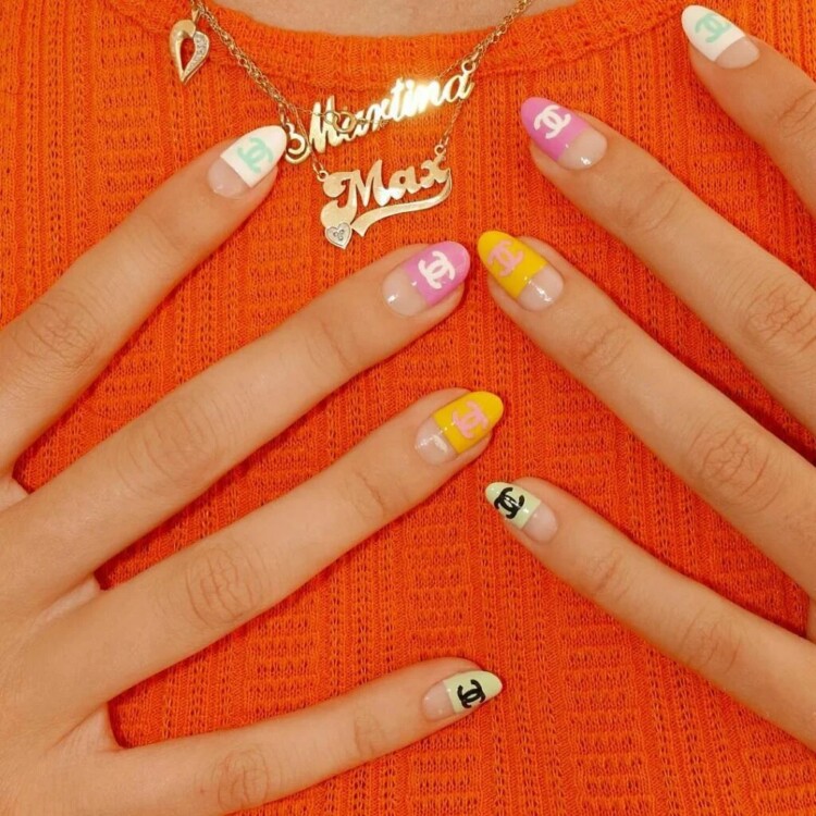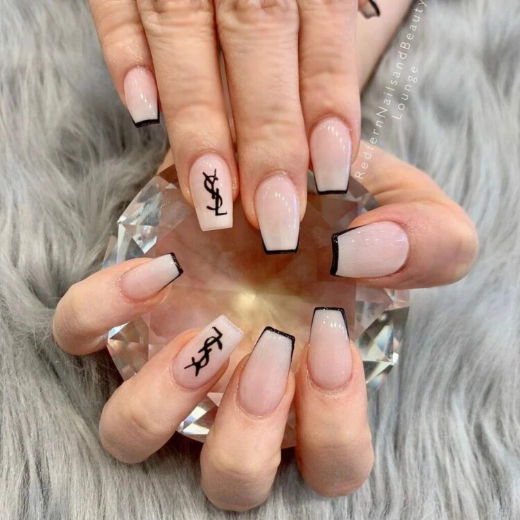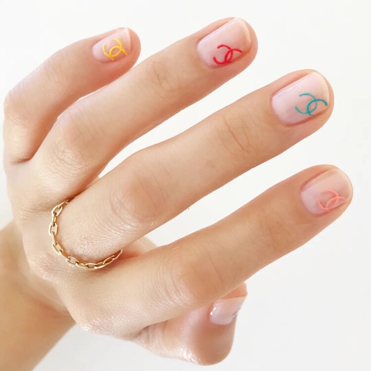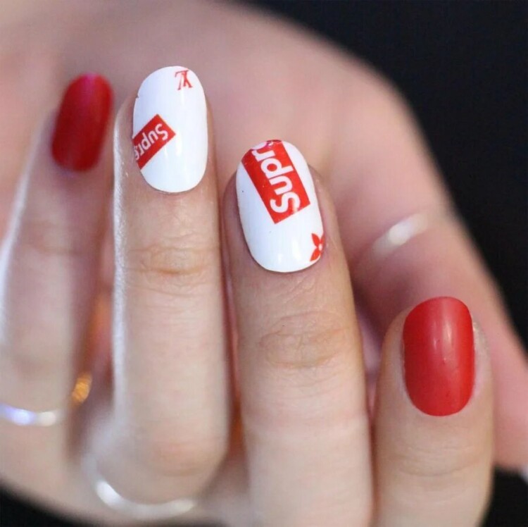 Для найяскравіших жінок, які не звикли залишатися в тіні можна виконати манікюр в стилі логоманіі. Будь-який відтінок підійде для даного виконання. Прекрасно виглядатимуть варіанти в світлих відтінках, виділяючи обраний логотип на нігтях. Достатньо виділити всього пару нігтиків, інакше можна перевантажити образ зайвими деталями.