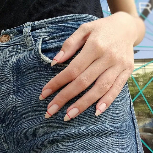 Іноді для ідеального манікюру достатньо однієї лінії. У нашому випадку червоної. І знову ж таки зверніть увагу на форму нігтів — вона мигдалеподібна, одна з наймодніших цього сезону.