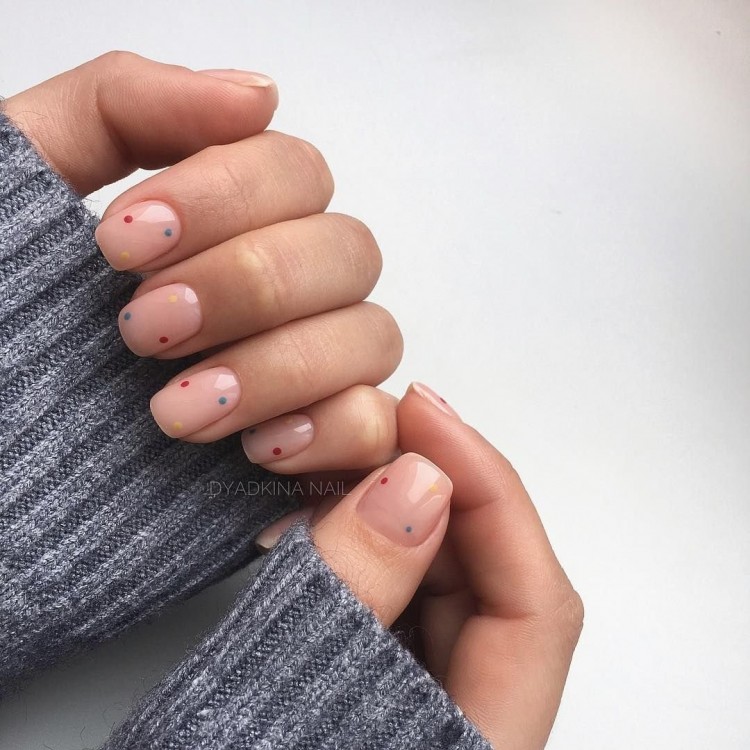 Наймиліший дизайн – нігті в горошок! З плюсів – він дуже простий: потрібно лише покрити нігті лаком тілесного кольору, після чого поставити на кожному пару різнокольорових цяток. Найзручніше малювати горошок за допомогою невидимки: просто вмочіть її круглий кінець у лак і віддрукуйте на пальці.
