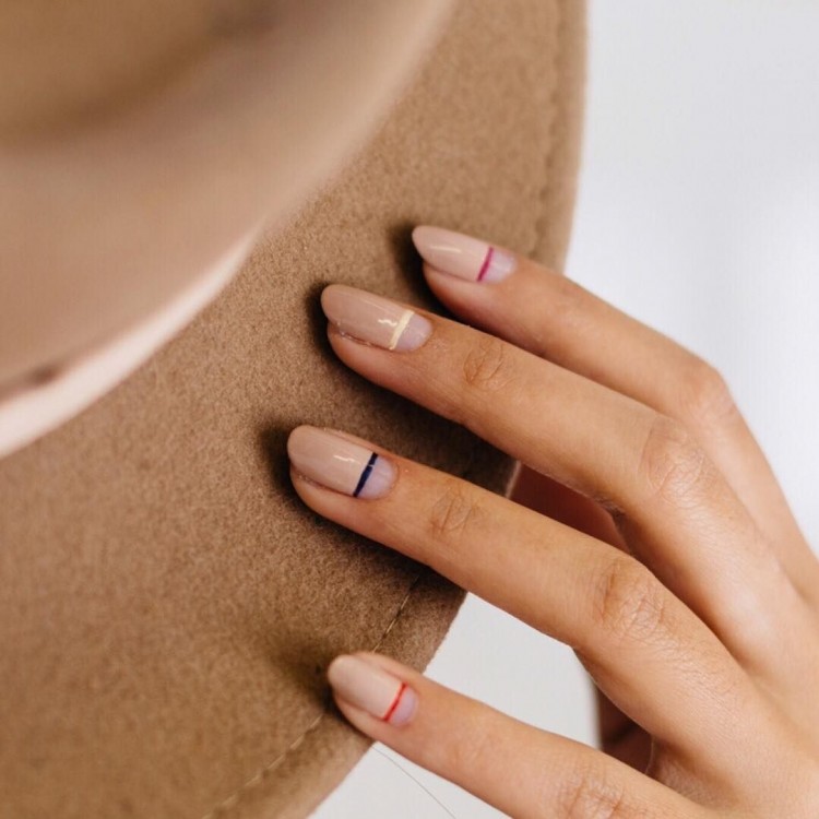 Якщо ваші нігті досить довгі, спробуйте ідею з асиметричною горизонтальною смужкою. Розташуйте її ближче до лунки, а не посередині, попередньо покривши нігті однотонним лаком.