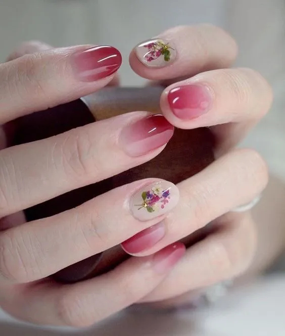 За допомогою губки для миття посуду можна зробити перехід від світлого до темного: нанесіть світлий лак вниз губки, а темний – трохи вище. Потім зробіть м’який перехід між відтінками, змішавши їх просто на губці. Все, що залишиться зробити, – надрукувати малюнок на нігті, а на один з нігтів приклеїти наклейку з квітами.