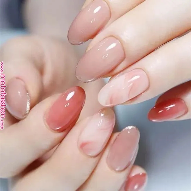 Не зупиняйтеся на одному дизайні, натомість вибирайте відразу кілька акцентів. Чудове поєднання — нюдовий колір та малюнок на декількох нігтяг. Наприклад, із такими красивими акварельними розводами. Але головний акцент у цьому манікюрі – блискучі деталі у лунці. Завдяки їм дизайн виглядає особливим.