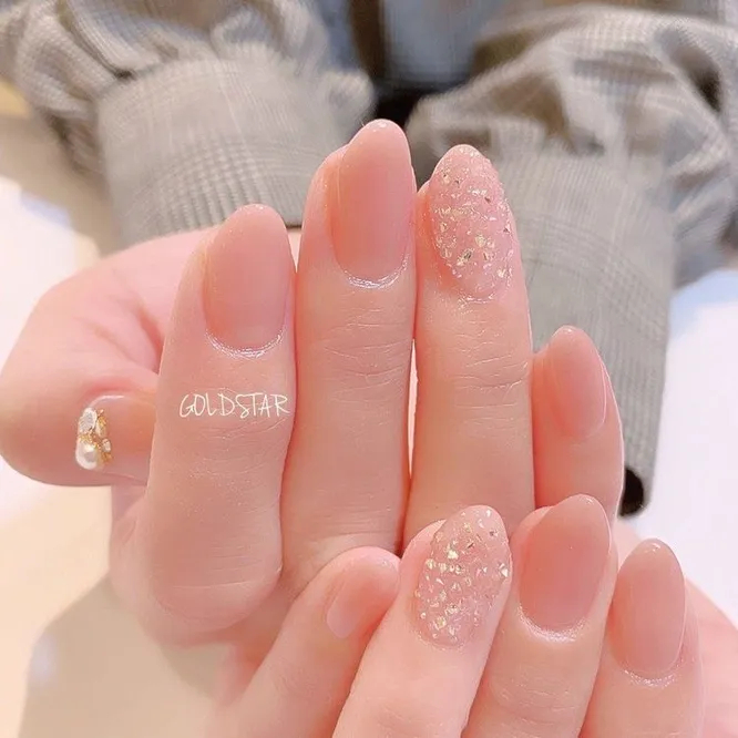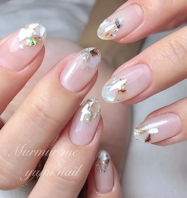 Дуже гарний дизайн, у якому акцент зміщений до краю нігтя. Наприклад, додайте до нюду папір, що переливається — такі нігті відразу привернуть увагу оточуючих! Щоб повторити його, вам потрібно розрізати спеціальну фольгу для нігтів на нерівні маленькі шматочки і розташувати їх від середини до краю нігтя у випадковому порядку. І не забудьте зверху все закріпити прозорим лаком. Блискучий манікюр готовий!