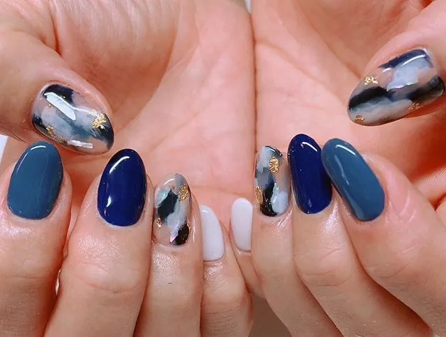 З приходом осені жінки люблять вибирати глибокі темні відтінки, тому ми вирішили знайти потрібний варіант і для таких осіб. Візьміть всі відтінки синього та блакитного, які є вдома або в салоні, та нанесіть їх окремо на кожен ніготь. А на великому та безіменному пальцях можна зробити дизайн у вигляді мазків пензлем, щоб урізноманітнити монотонність дизайну.