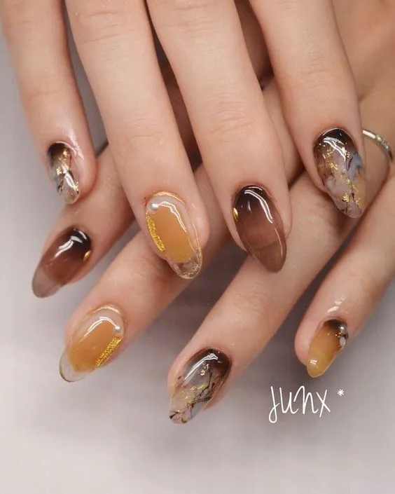 Прозорі нігті – один із головних трендів в азіатському манікюрі. Зробити їх допоможе майстер із нарощування. Покажіть йому це фото, нехай надихнеться осінніми відтінками!