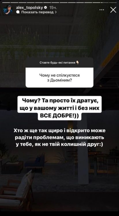 А ще він розповів свою версію припинення спілкування. За словами Алекса Топольського, їхня дружба закінчилась через те, що телеведучий завжди радів лише проблемам бізнесмена. Також чоловік додав, що Слава Дьомін постійно йому заздрив. Чоловік не міг порадіти досягненням свого друга. Він постійно критикував Алекса Топольського та ніколи не підтримував.