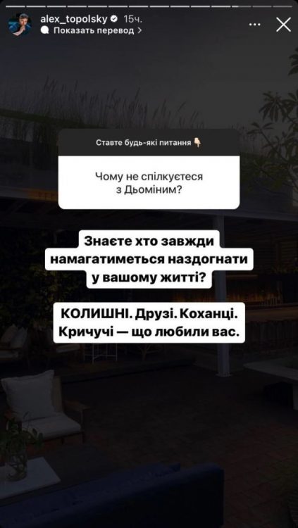 Відомо, що Слава Дьомін товаришував з бізнесменом ще з самого дитинства. Ба більше, вони навіть були кумами. Однак, наразі колишні друзі не спілкуються. Такими подробицями Алекс Топольський поділився в Instagram-stories. На публікацію чоловіка відреагувала велика кількість підписників. Вони заявили, що були дуже вражені зізнанням чоловіка. А ще юзери побажали Алексу Топольському мати лише вірних друзів у житті.