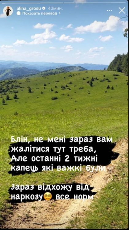 Про це вона розповіла в Instagram-stories. За словами Аліни Гросу, протягом останніх двох тижнів стан її здоров’я дуже погіршився. Співачка була змушена звернутися до лікаря. Що саме трапилось з виконавицею, вона не повідомила.