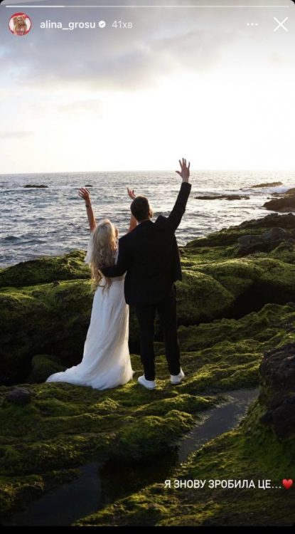 Нещодавно співачка приємно здивувала фоловерів. Вона все-таки підтвердила, що вдруге вийшла заміж. Аліна Гросу поділилась романтичним фото з чоловіком. Новоспечене подружжя постало перед камерою на тлі красивих краєвидів. Співачка позувала в білосніжній сукні, а її коханий одягнув святковий костюм чорного кольору.