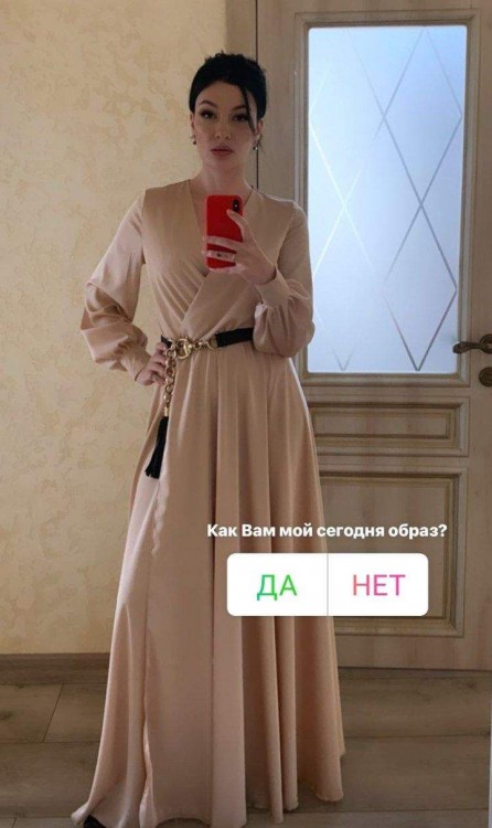 Перед камерою вона постала у довгій сукні бежевого кольору з чорним поясом. Також артистка зробила красиву зачіску й бездоганний макіяж. Свій образ вона доповнила сережками-підвісками.