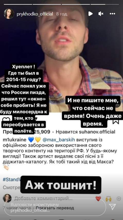 Однак, такі позиції зірок неабияк розчарували Анастасію Приходько. В Instagram-stories вона вщент розкритикувала своїх колег. За словами Анастасії Приходько, вона не розуміє, чому Тіна Кароль та Макс Барських мовчали останні вісім років, коли на Донбасі відбувалась запекла війна.