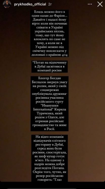 Співачка часто критикує зірок, які перебувають за кордоном під час війни. Вона ніколи не боїться висловлювати свої думки, тому завжди говорить те, про що думає. Зі словами Анастасії Приходько погодилась чимала кількість підписників. Вони заявили, що ситуація з Потапом неабияк їх обурила. Фоловери чекають, коли репер пояснить свій відпочинок в Дубаї в компанії росіян.