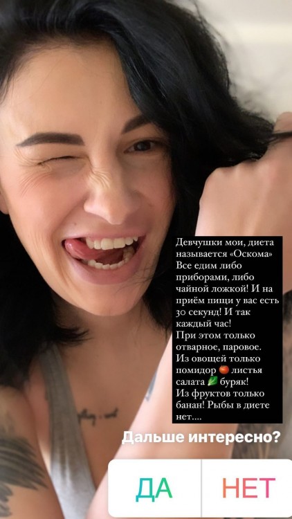 Анастасія Приходько поділилась з кумирами ефективною дієтою, завдяки якій їй вдалося схуднути на один кілограм. За словами жінки, дієта називається “Оскома”. Її суть полягає в тому, що на прийом їжі є лише 30 секунд. Артистка харчується лише паровою їжею. А ще вона вживає овочі й фрукти.