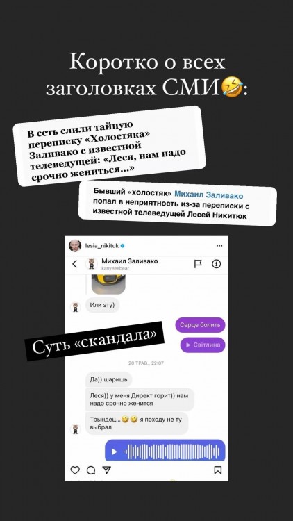 Шахраї зламали сторінку жінки в Instagram й показали всі таємні переписки. Однією з них була переписка з Михайлом Заливако. Чоловік написав Лесі Нікітюк, що помилився у своєму виборі, натякнувши на можливі стосунки з телеведучою.