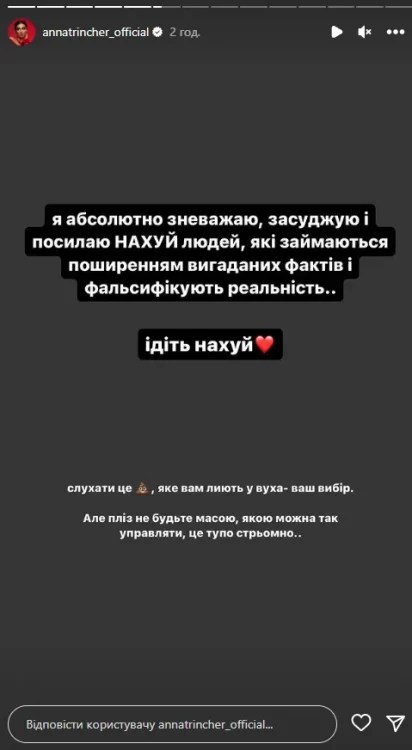 “Я абсолютно зневажаю, засуджую і посилаю нах*й людей, які займаються поширенням фактів і фальсифікують реальність…Ідуть нах*й”, – емоційно заявила Анна Трінчер. Також блогерка додала, що ніколи не пробачить зраду.