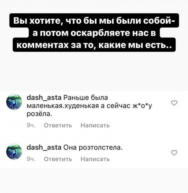 За словами співачки, люди, які пишуть їй негативні коментарі, зовсім нетолерантні. Виконавиця заявила, що ніхто не має права її ображати. А ще Анна Трінчер звернулась до своїх фоловерів й попросила бути вихованими та тримати свою думку при собі.
