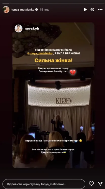 “Під вечір на сцену вийшла Тоня Матвієнко. Я була вражена! Сильна жінка! Дякуємо! Співчуваємо вашій втраті. Перший вихід на сцену після смерті матері. Вся зала слухала з тремтінням серця”, – прокоментувала виступ співачки фанатка. Як виявилось, глядачі залишились дуже задоволеними. Вони вважають співачку дуже сильною та мудрою жінкою.