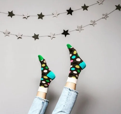 Зараз актуально поєднувати шкарпетки з різних пар. Вони можуть бути однотонними або з ненав’язливим малюнком. Наприклад, одна шкарпетка насичено-зелена, а на іншій цей колір розбавлений великим білим горохом.