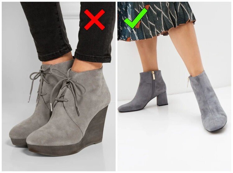 Часто на вулицях можна зустріти ботильйони, як на фото зліва – нерідко вони виявляються ще й у компанії сукні з першого пункту. Пам’ятаємо про те, що танкетка і товста платформа біля носка – сьогодні не актуальні.
