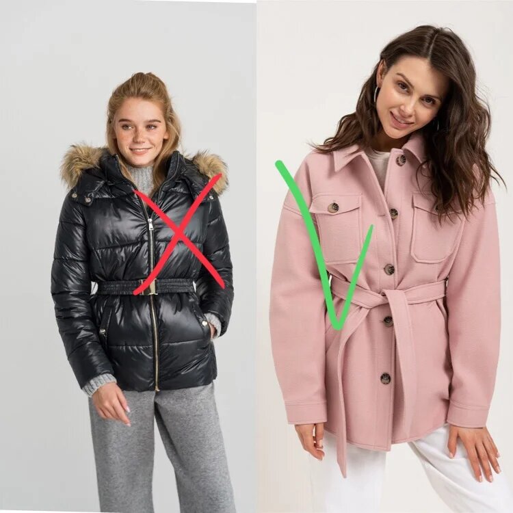 Хутряний капюшон, глянець і не правильна довжина куртки зіпсують ваш модний образ. На заміну можна взяти трендову куртку-сорочку з поясом.