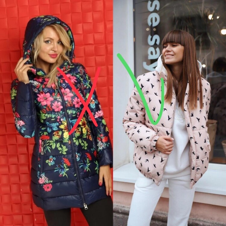 Для любительок яскравого образу категориично не підходить куртка в квіточку. Довжина моделі на фото теж жахлива, оскільки дуже сильно вкорочує ноги.