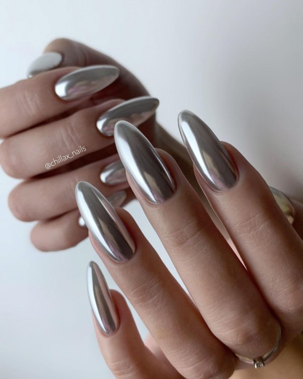 Здається, улюбленому тренду любительок блиску все-таки пора на пенсію. Це дуже красиво і святково виглядає але аж надто активно. Нігті «тотал хром» сьогодні виглядають як золоті зуби: недоречна демонстрація несмаку. Сучасні тенденції пропонують використовувати дзеркальні і голографічні втиркі максимум в якості акценту на один-два пальчика, і в такому випадку міксувати їх з матовими нюдами або молочним відтінком.
