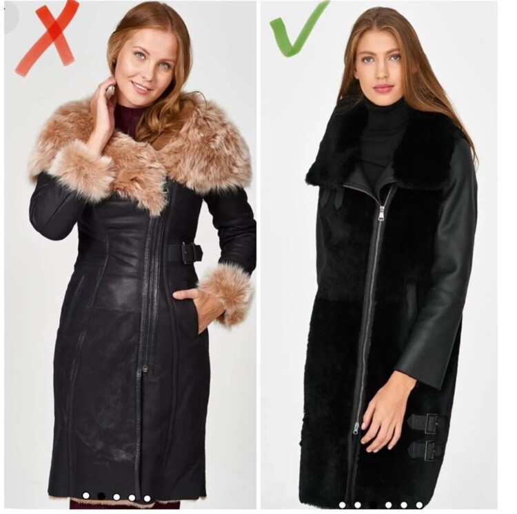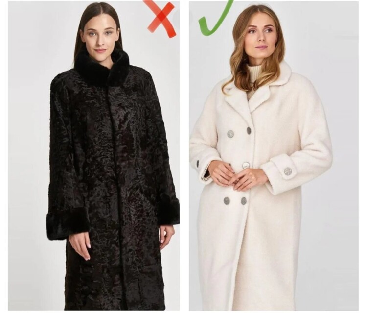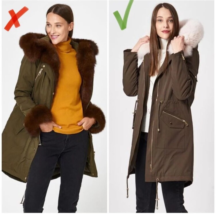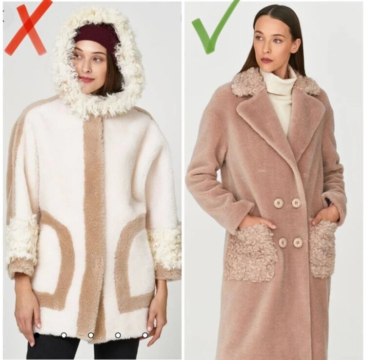 Шуби зі штучного хутра – це також не завжди тренд. У неї теж повинен бути актуальний крій. Укорочені рукава, як на фото зліва – сумнівне рішення для зими. Та й контрастна обробка по застібці і кишенях виглядає дивно. А ось однотонна шубка в довжині міді прослужить вам не один рік.