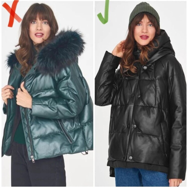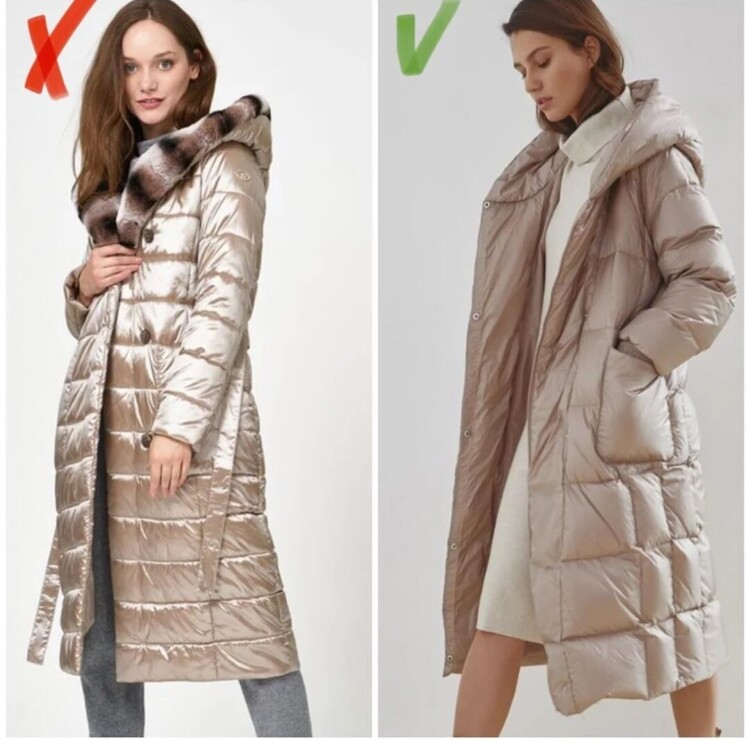 Подовжені пуховики будуть ідеальним варіантом зимового верхнього одягу для тих, хто любить носити сукні та спідниці. Стежимо за тим, щоб посадка була досить вільною, а стібка – об’ємної, не як на фото зліва. Уникаємо хутряної облямівки.